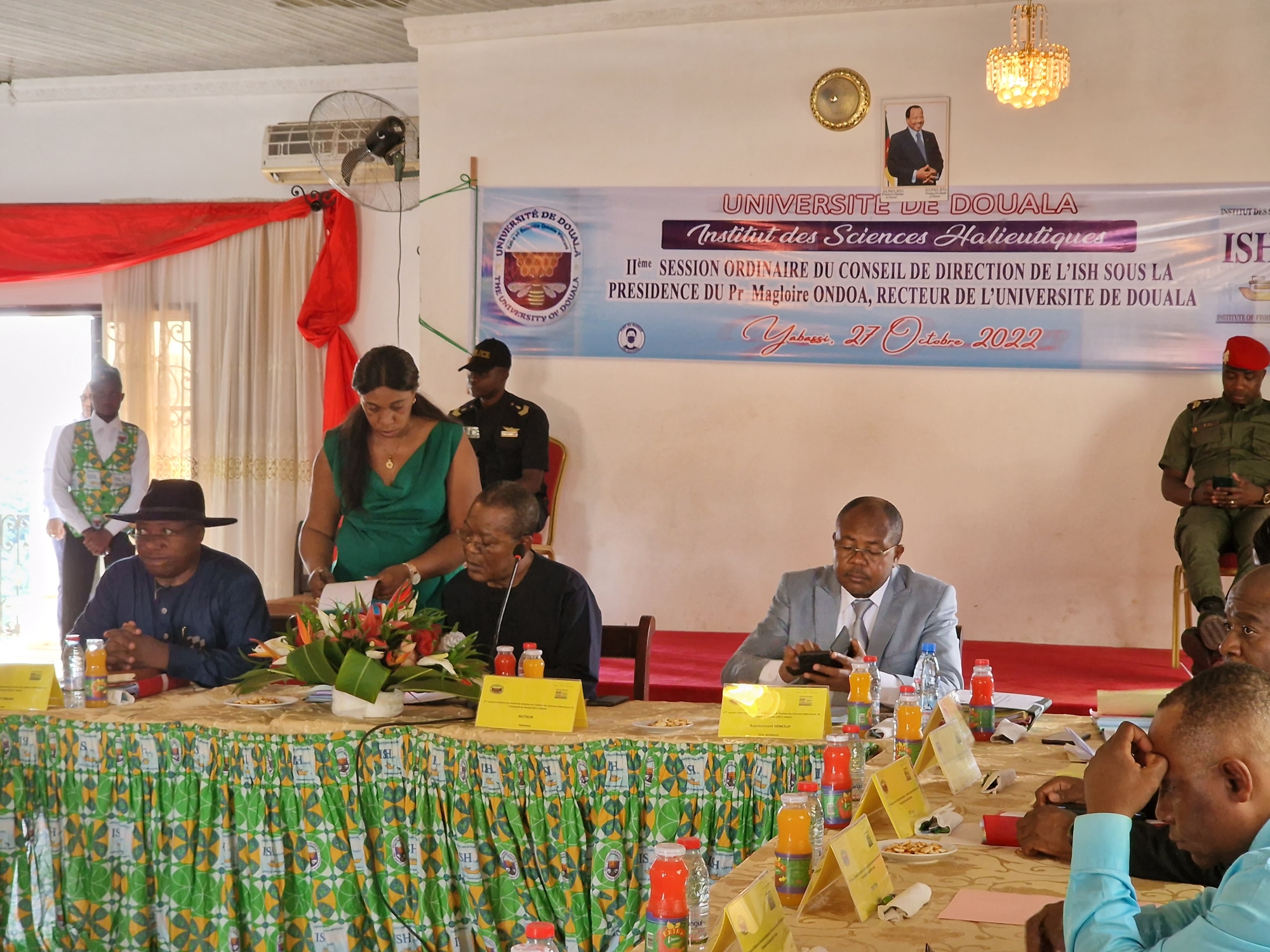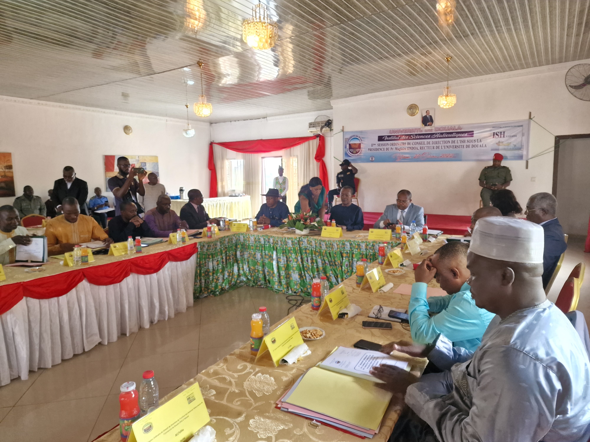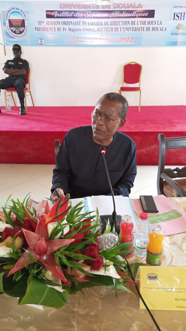 Après avoir passé une agréable nuit de repos la veille, Monsieur le Recteur et sa suite ont participé aux travaux de la deuxième Session ordinaire du Conseil de Direction de l’ISH à l’Hôtel Titina. Cette Deuxième Session du Conseil de Direction de l’ISH, d’après le Recteur dans son discours d’ouverture, est le continuum de son Premier avec comme principal objectif la modernisation de ses infrastructures pour une consolidation de ses acquis, gage de son rôle majeur dans l’accomplissement de ses missions régaliennes. Le Recteur a aussi souhaité que les travaux se déroulent dans une harmonie conviviale sur fond de débats féconds et constructifs Il a ensuite déclaré ouverts les travaux sous une salve d'applaudissements de l'Auguste Assemblée. La quête permanente de l'excellence dans les formations dispensées à l’Institut des Sciences Halieutiques pour le compte de l'année académique 2021/2022 a donné lieu à un taux de réussite de 86,98% sur 484 étudiants toutes filières confondues. Le volet Recherche et Coopération quant à lui a été marqué par la tenue des séminaires, des ateliers, des stages et rencontres scientifiques, notamment le séminaire scientifique avec le monde des Entreprises organisé à Douala, le séminaire scientifique portant sur la rédaction des articles scientifiques.