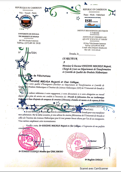 Lettre de félicitations de Monsieur le Recteur de l'Université de Douala